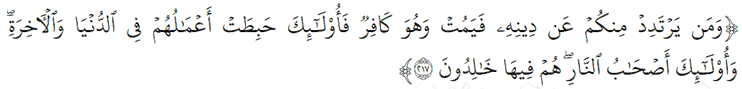 Ma chi recede dalla propria Religione e muore da miscredente, ebbene… costoro van perse le opere loro nella bassa vita e nell’Oltre: sono questi i compagni del Fuoco, e vi staranno in perpetuo.»